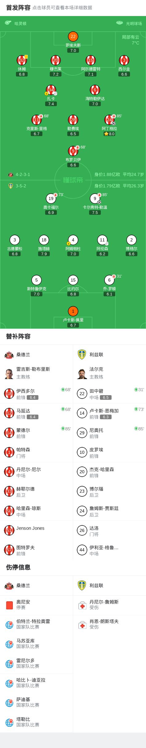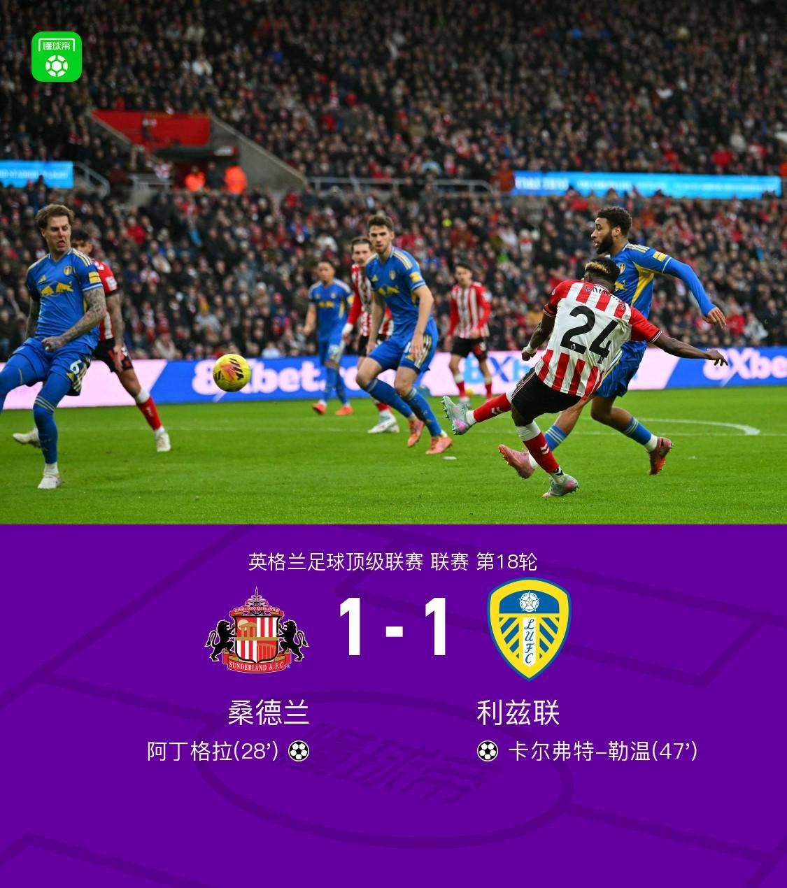 北京时间12月28日英格兰足球顶级联赛 联赛 第18轮,桑德兰主场对阵利兹联。上半场,扎卡助攻阿丁格拉破门。下半场,阿伦森助攻卡尔弗特-勒温扳平。最终比分桑德兰 1-1 战平利兹联。
