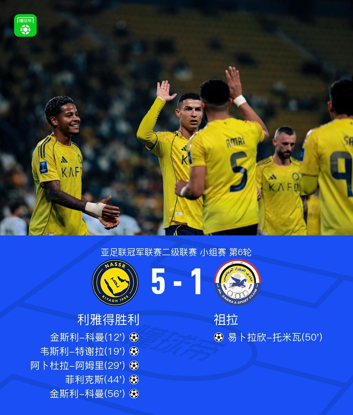 北京时间12月25日亚足联冠军联赛二级联赛 小组赛 第6轮,利雅得胜利对阵祖拉。上半场,科曼率先破门。随后,特谢拉禁区内乱战得分。菲利克斯开出角球,阿姆里头槌建功。C罗挑传,菲利克斯挑射得分。下半场,托米瓦为客队扳回一城。菲利克斯精妙漏球,科曼再下一城。全场比赛结束,胜利5-1轻取祖拉,以全胜成绩成功小组出线。