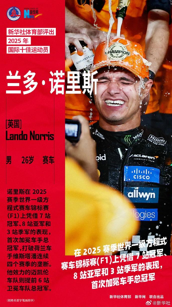 诺里斯在2025赛季世界一级方程式赛车锦标赛(F1)上凭借7站冠军、8站亚军和3站季军的表现,首次加冕车手总冠军,打破荷兰车手维斯塔潘连续四个赛季的垄断。他效力的迈凯伦车队则提前6站卫冕车队总冠军。