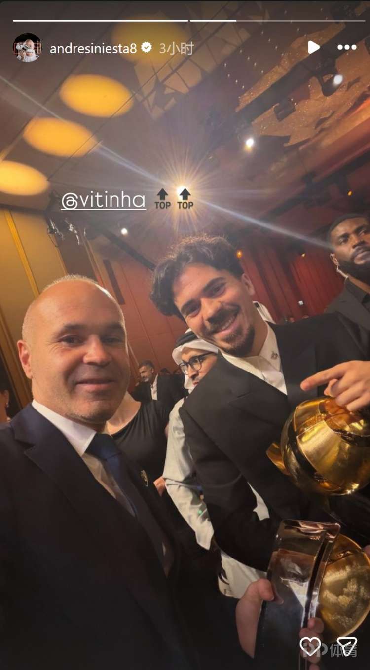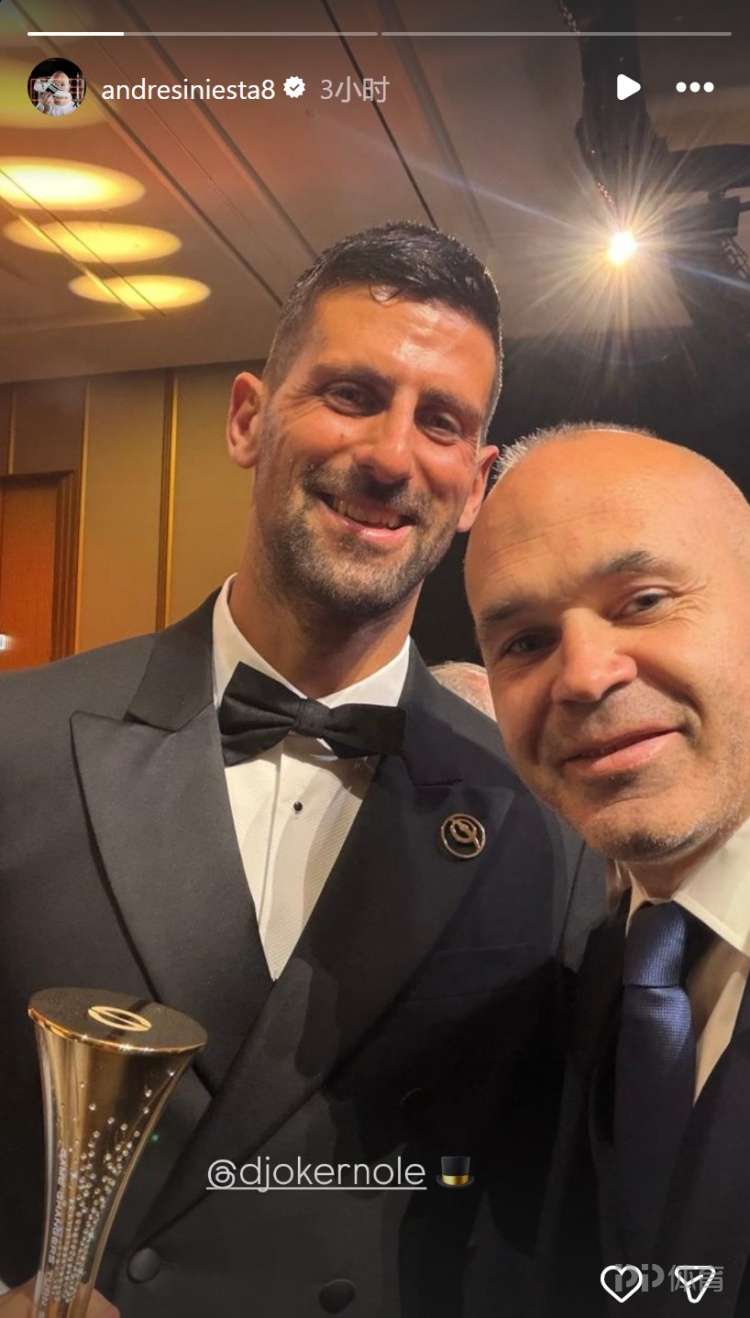 伊涅斯塔更新社媒动态,晒出与德约科维奇、维蒂尼亚的合照。伊涅斯塔出席环足奖颁奖典礼,并获得生涯贡献奖,他在社交媒体上晒出与德约科维奇、维蒂尼亚的合照。