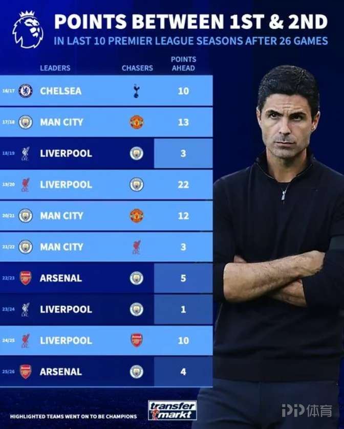 德转盘点了过去10个英超赛季,在26轮比赛后领先者与追赶者之间的积分差距,并标出最终成为冠军的球队。