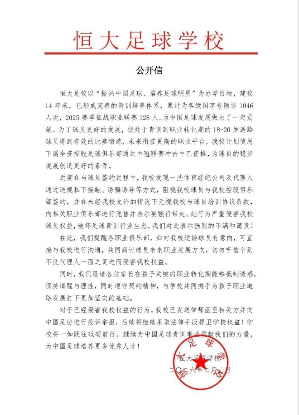 2月3日,恒大足校通过代理律师正式向杨黔东及其监护人就其违反培训协议约定等发出律师函,并抄送相关的上海海港足球俱乐部。