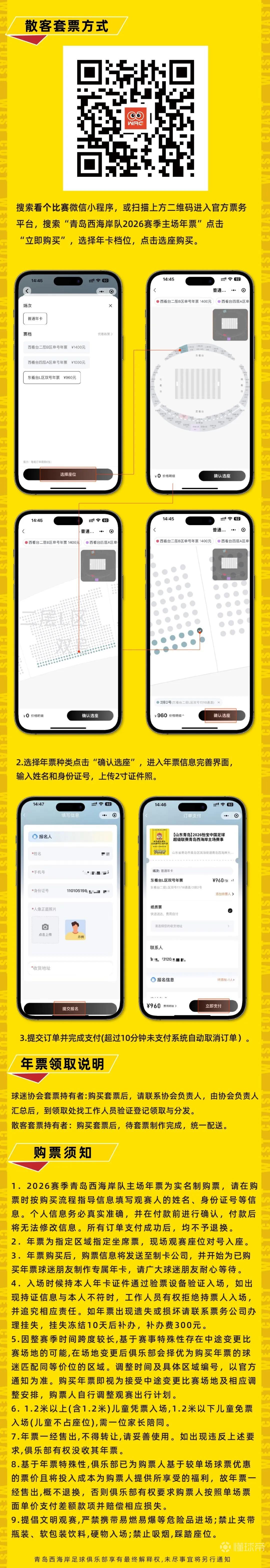 北京时间2月14日,青岛西海岸公布2026赛季主场套票的价格,散客套票分为三档,价格分别为960元、1080元、1400元。