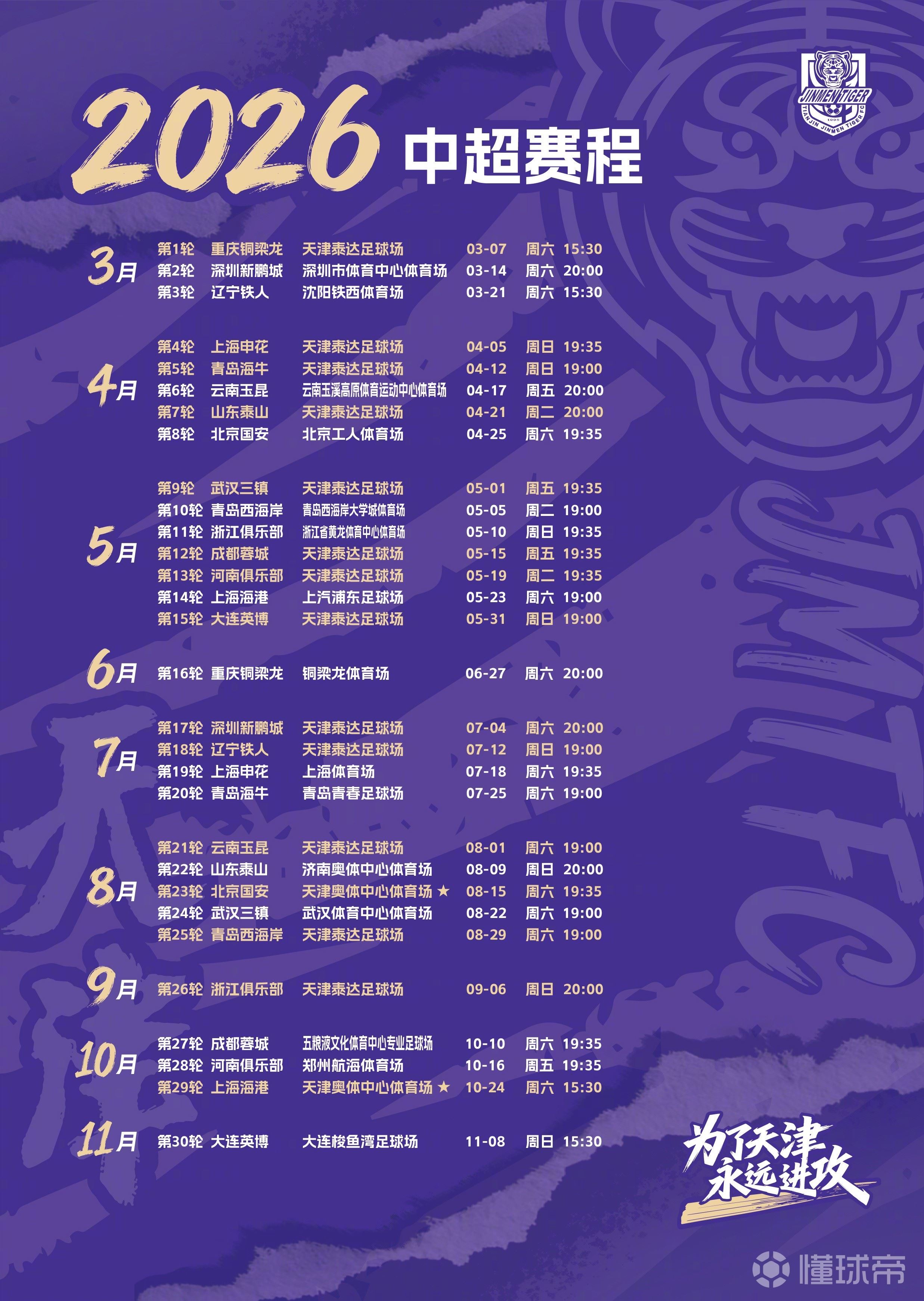 2026赛季中超联赛赛程公布,天津津门虎发布新赛季赛程。津门虎将在37日首轮于泰达足球场主场迎战中超新军重庆铜梁龙,815日第23轮与北京国安、1024日第29轮与上海海港的两场比赛将在天津奥体中心体育场进行。
